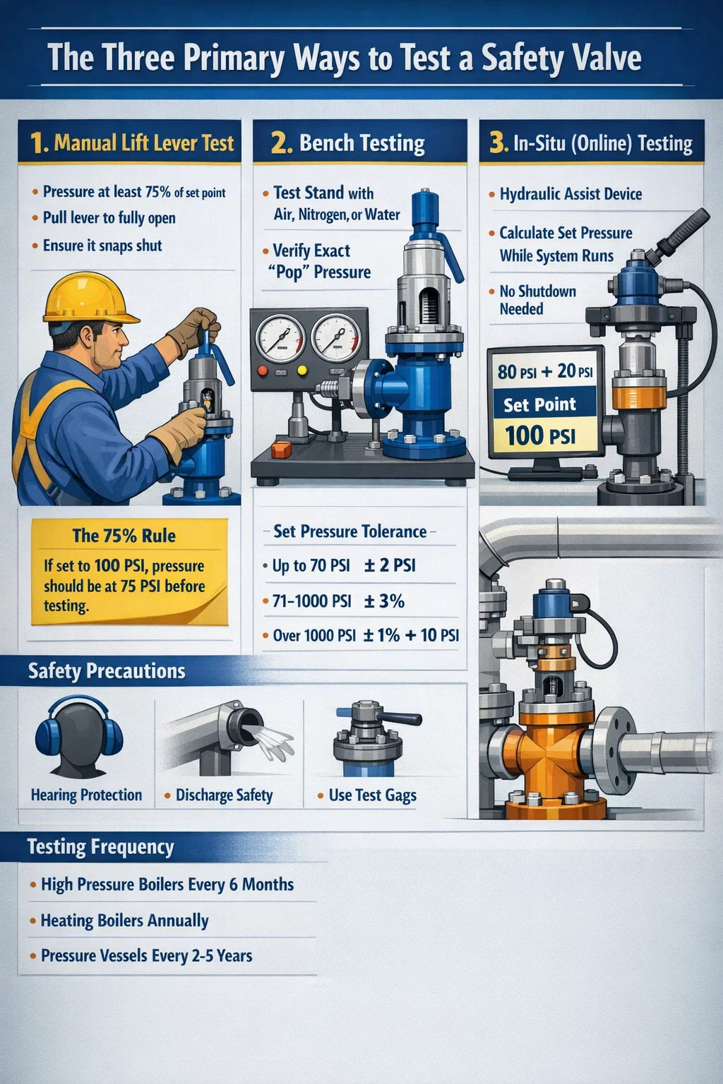 To ensure a safety valve functions correctly, it must be tested using one of three primary methods: Manual Lift Testing using the physical lever, Bench Testing on a dedicated test stand, or In-Situ Testing (also known as Online Testing) using high-precision hydraulic assist tools.