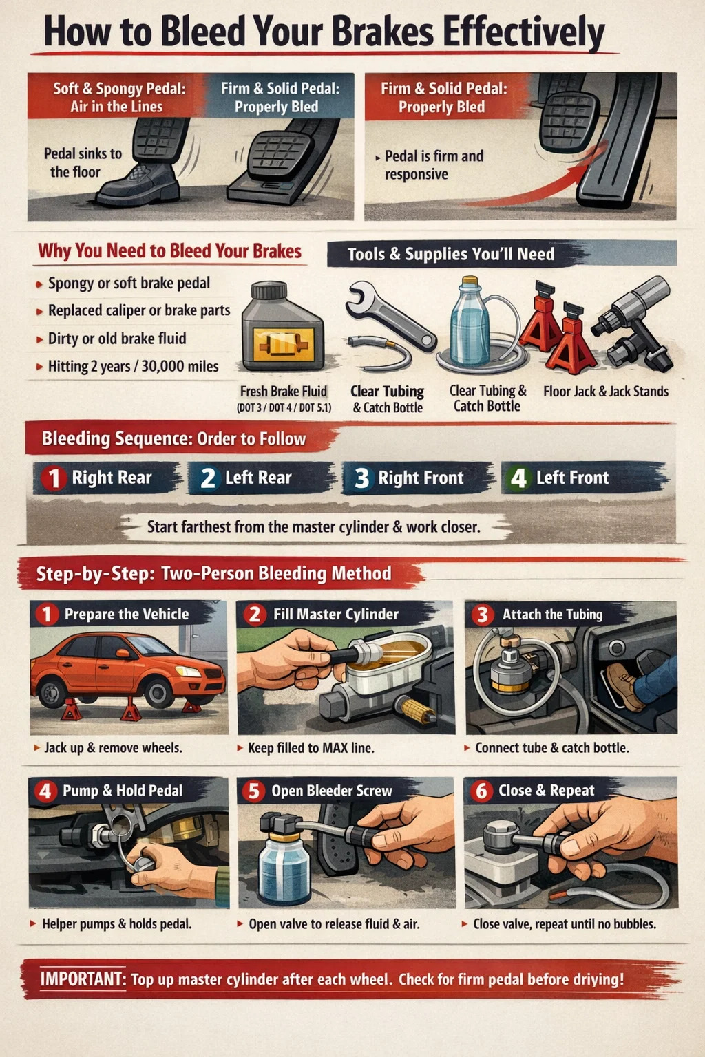 Bleeding your brakes means pushing old fluid and any trapped air out of the hydraulic brake lines until fresh, air-free fluid fills the system from master cylinder to caliper. The result is immediate: a firm, consistent pedal instead of a soft, spongy one. If you can press the brake pedal more than halfway to the floor before feeling solid resistance, there is almost certainly air in your lines, and bleeding is overdue.