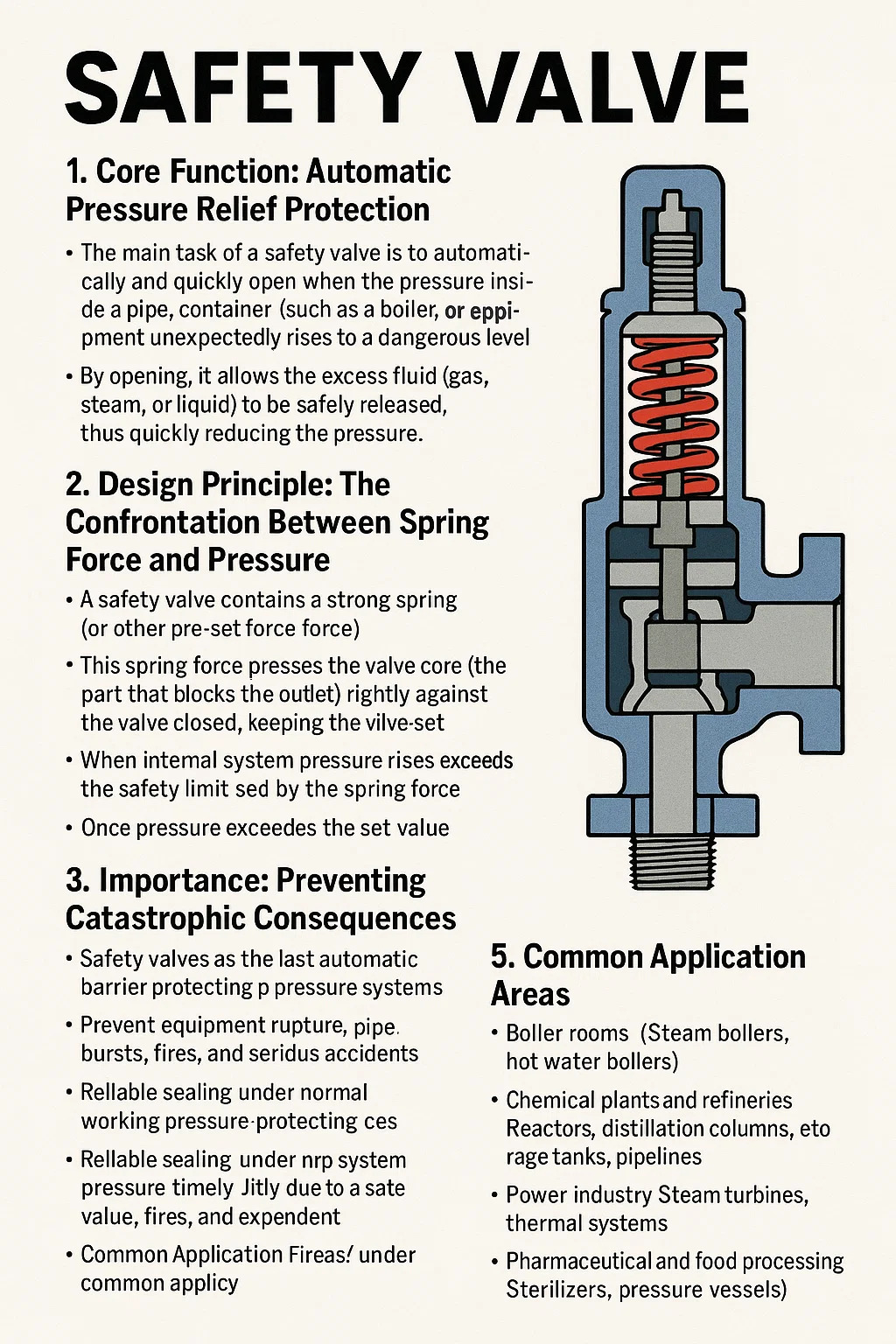 A safety valve is a very important industrial safety device; simply put, it acts like an automatic "pressure relief valve." Here is a point-by-point explanation of safety valves: