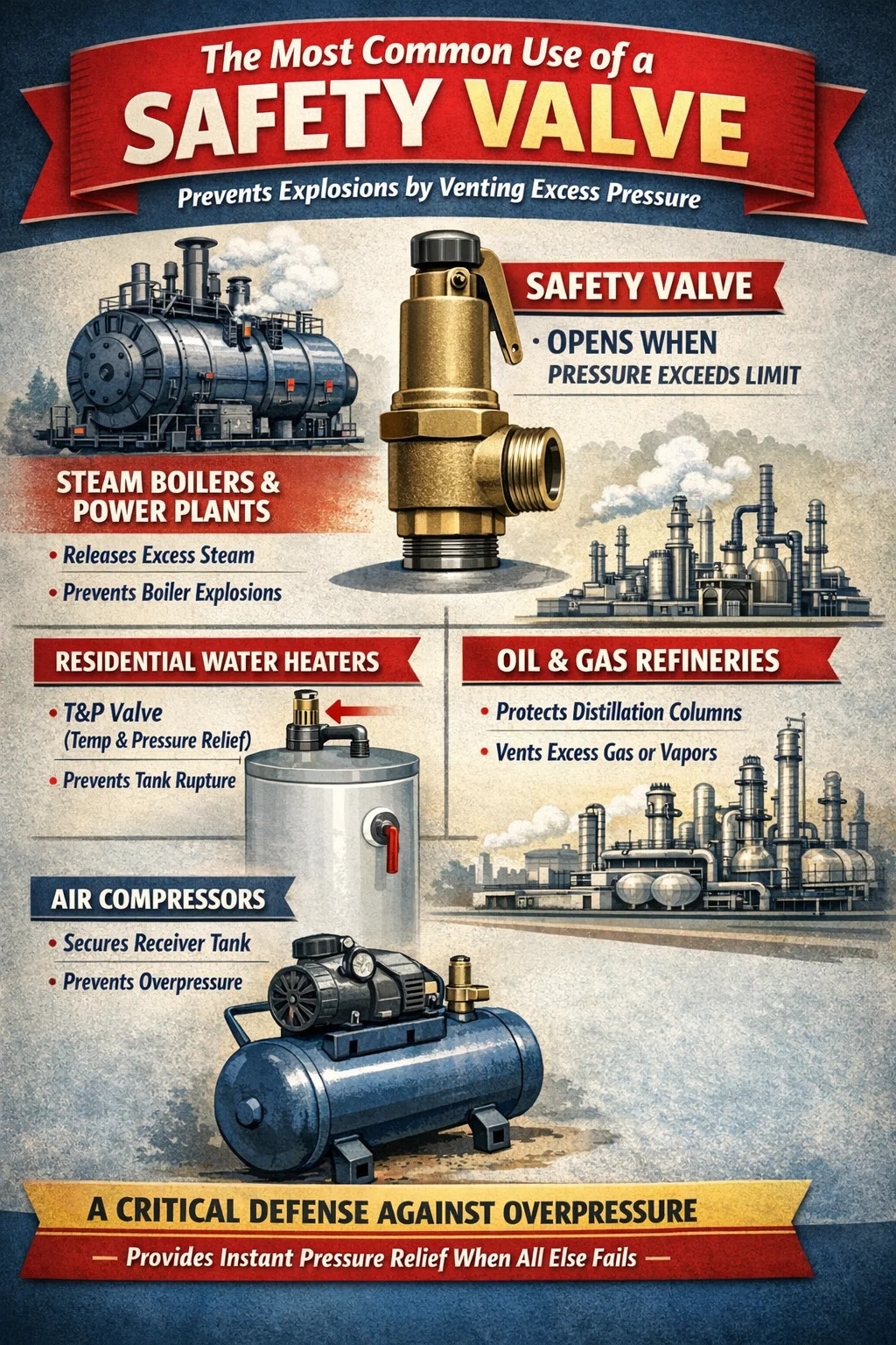 Oil refineries and chemical processing plants handle volatile fluids under extreme pressures. Here, the safety valve is used to protect distillation columns, storage tanks, and reactors from "over-pressuring" during a fire or a chemical reaction surge.
